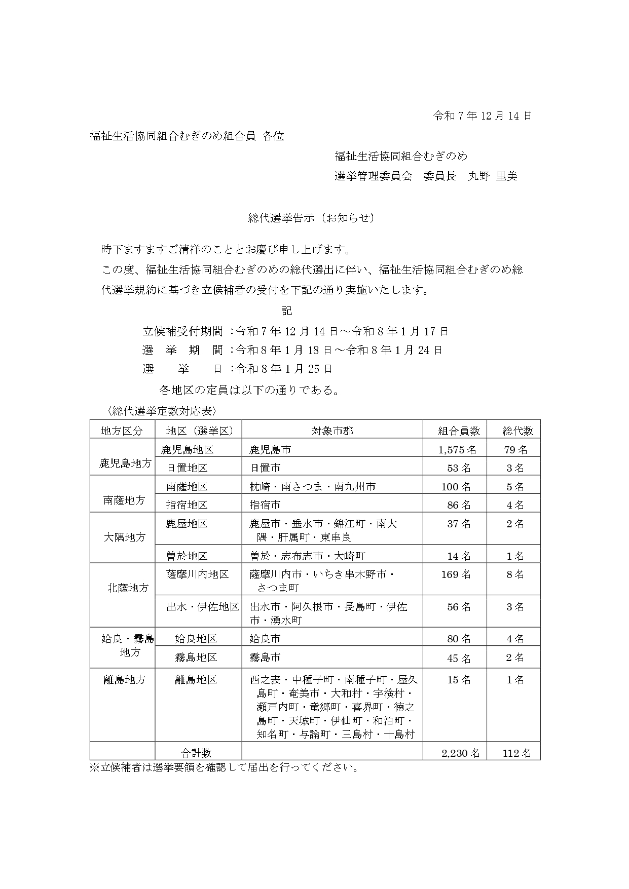 組合員の皆様におかれましては、ますますご清祥のこととお慶び申し上げます。 この度、福祉生活協同組合むぎのめでは、総代選挙規約に基づき総代選挙を実施いたしますつきましては、令和7年12月14日より立候補者の受付を開始いたしました